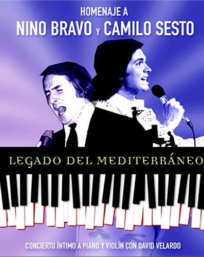 Nino Bravo estaba considerado como la mejor voz del pop nacional en el final de los sesenta y principios de los setenta. Camilo Sesto fue cantautor, productor y compositor de balada romántica, pop y rock. Los éxitos de ambos cruzaron las fronteras. Llenaron infinidad de comentarios elogiosos. Triunfaron como nunca y se convirtieron en referentes.Hoy David Velardo nos propone un show de 75 minutos con músicos en vivo para todos los públicos basado en los mejores éxitos de este valenciano y de este alicantino de referencia, que configuran “Legado del Mediterráneo”.