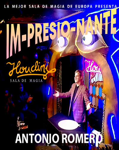 Vuelve “Impresionante”! un show de magia, ingenio y diversión a pocos centímetros de tus ojos. Una actuación inolvidable de todo un Premio Mundial de Ilusionismo que ha recorrido muchos rincones del planeta.Una actuación llena de misterio, viajes imposibles, predicciones, transformaciones, adivinaciones y un sinfín de sucesos increíbles en un lugar único lleno de encanto. Un Show estrella de la Sala Houdini que ha roto con todas los records de esta mítica sala madrileña.Antonio Romero, Premio Mundial de Innovación, te hará pasar al otro lado del espejo con una actuación tremendamente original y única en La Sala Frakson de Houdini.Numerosos premios le avalan:Premio Mundial de Innovación.Premio Ascanio.Premio Nacional de Micromagia.Mejor Mago del Año.Primer Premio de Magia de Cerca de Portugal.Premio European Magic Championship – Japon Adwards.Cups and Balls Museum Las Vegas (USA).Antonio Romero es además, Socio de Mérito de la Sociedad Española de Ilusionismo.